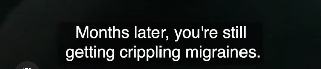 한밤중에 어지러움, 현기증, 오심으로 잠에서 깬다. 수개월 후에도 여전히 극심한 편두통.